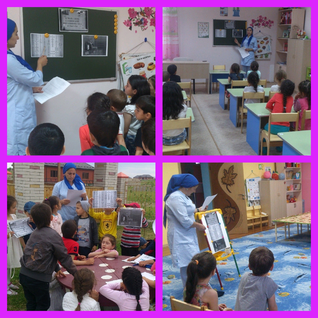 26.05.2016С целью ознакомления воспитанников с историей возникновения письменности, создателями алфавита, с культурой и наследием народа, воспитанием любви к Родине, чувство гордости за страну, в которой живем, 24 мая 2016 года, воспитатель старших и подготовительной группы, провели беседы с детьми на темы: "Создание славянского алфавита", "День славянской письменности и культуры", "Праздник славянской письменности".